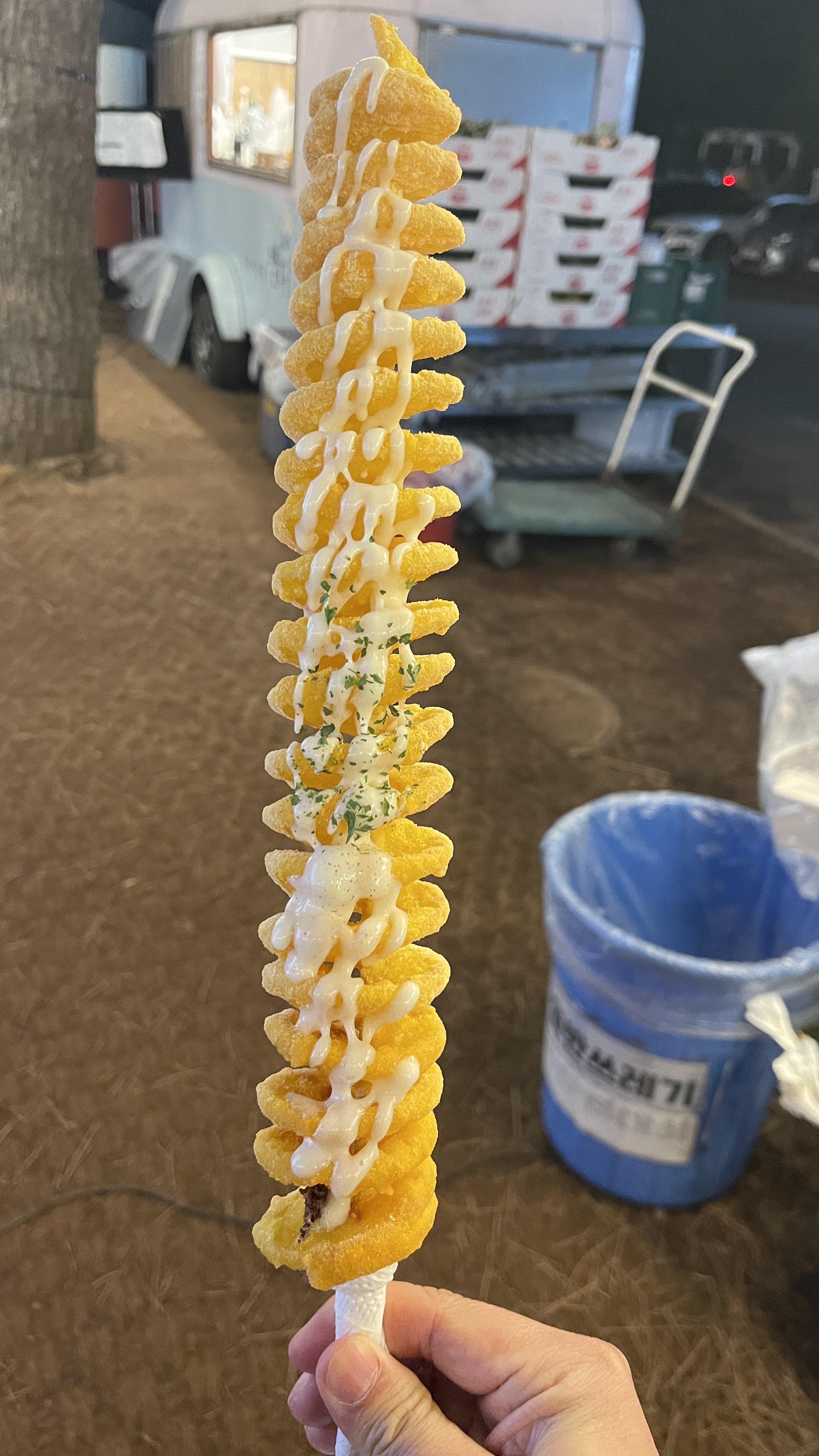 회오리 감자의 상태. 사실 여기서 회오리 감자를 처음 먹어봤다. 또 다른 지역에 살 때 휴게소에서 자주 봤는데 감자가 맛있다고 해서 건너뛰는 경우가 많았는데 여기서 먹어보니 감자가 이렇게 맛있을 수가 있나 싶었다. 치즈가루와 소스, 감자의 조합은 천상이었다. 싶어지는 맛이 좋아요. 다른건 안먹어도 이따금씩은 먹었습니다.
