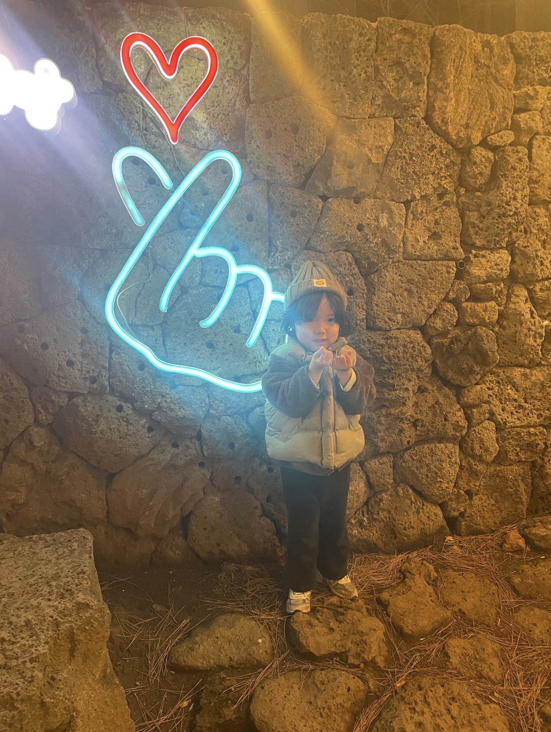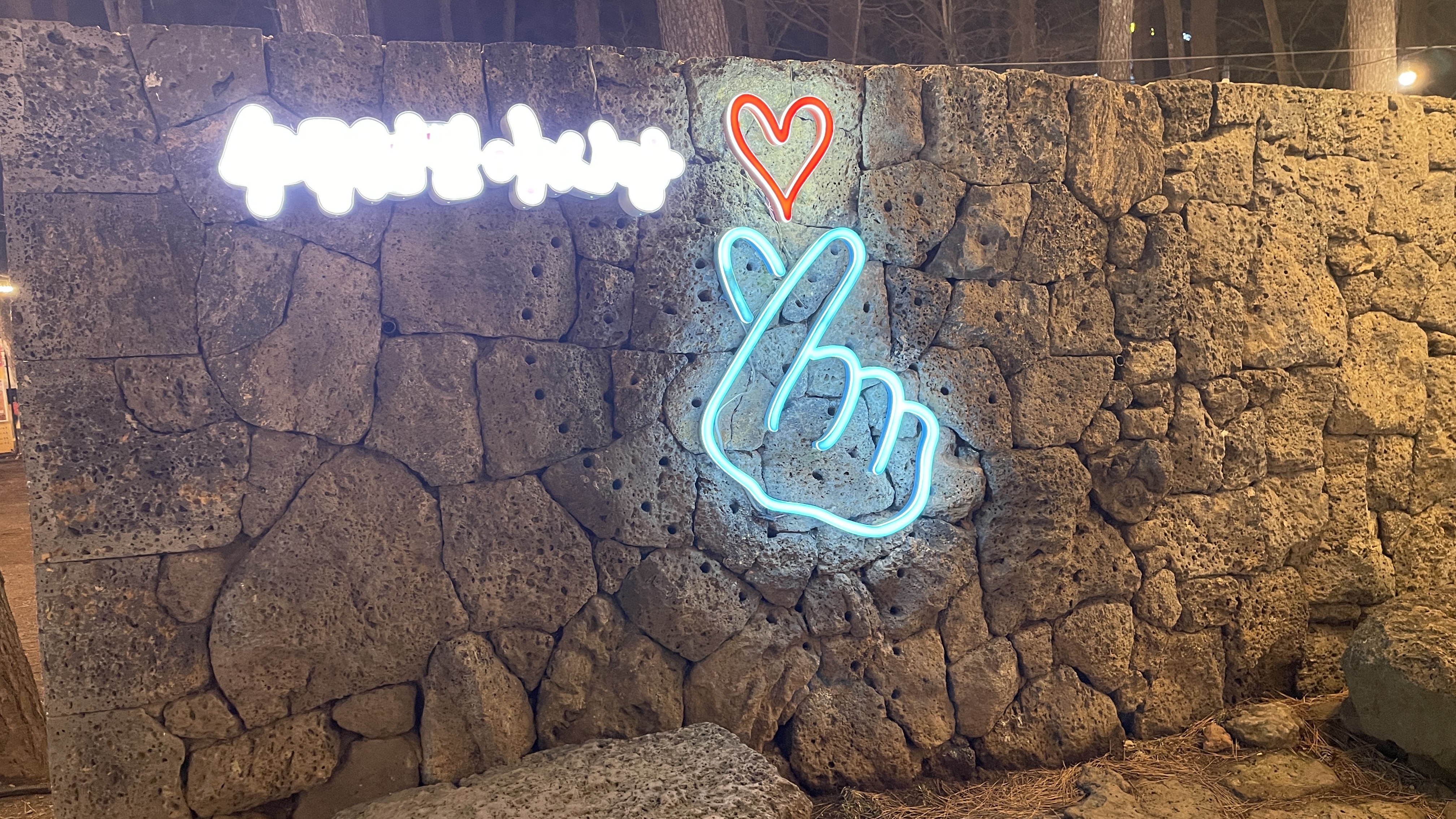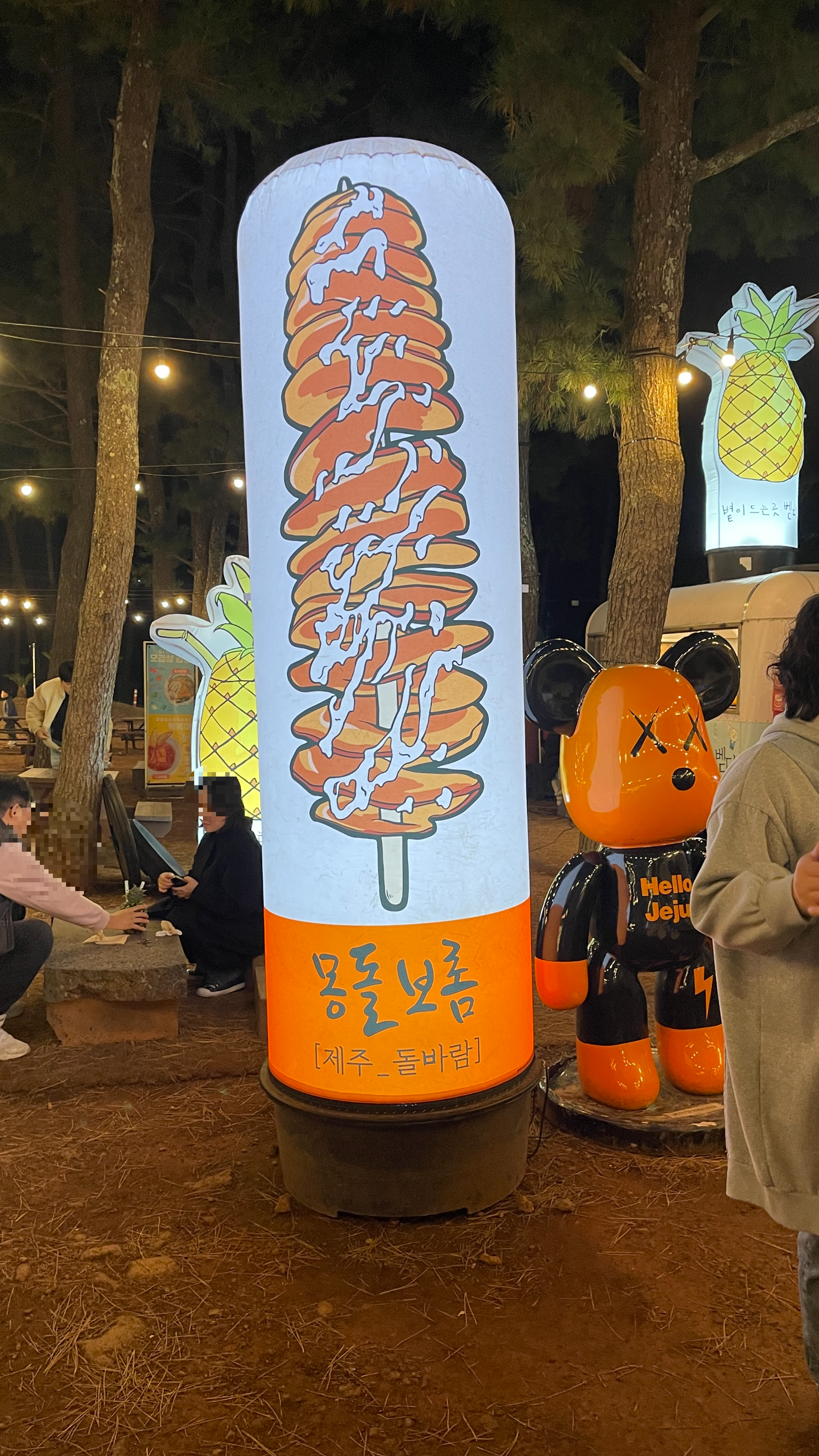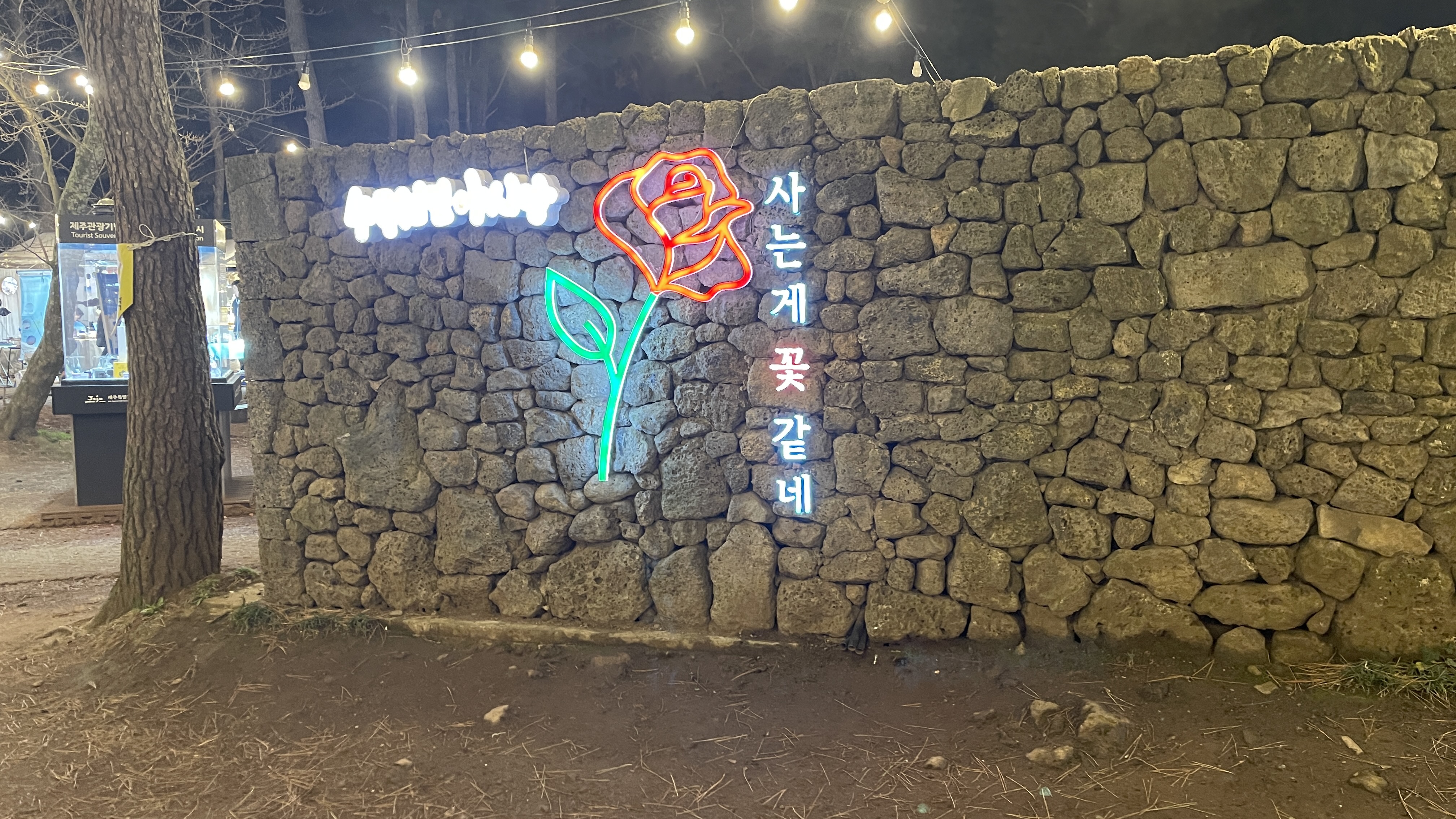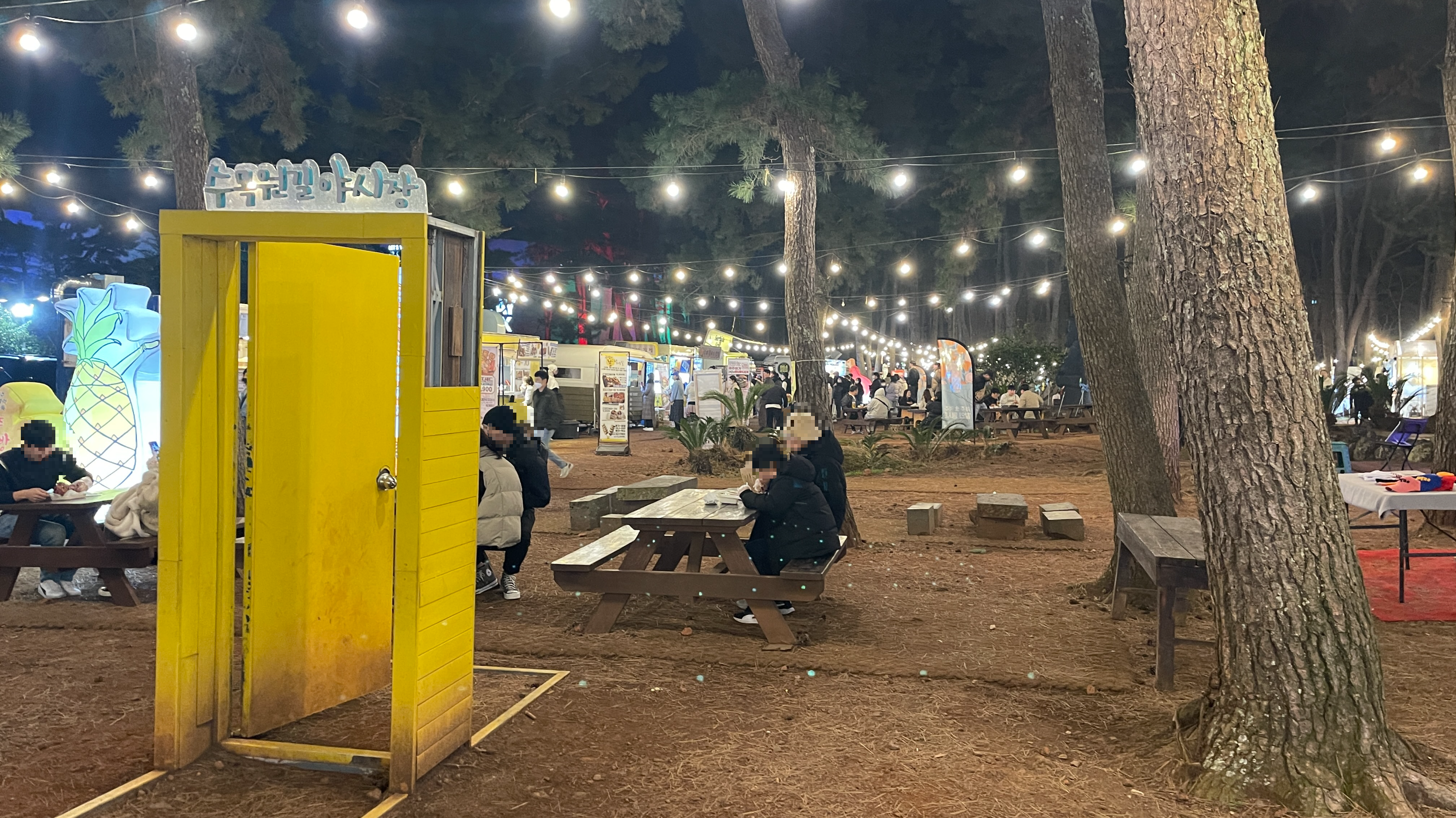 야시장 한복판에는 제주 돌담 양쪽으로 포토존이 있다. 색감이 예뻐서 아이들 사진 찍기에도 좋지만, 심야 데이트를 하는 연인들도 서로 사진 찍기 바쁘다. 수목원 야시장을 다녀오셨다면 놓치기 힘든 포토스팟이기도 합니다.